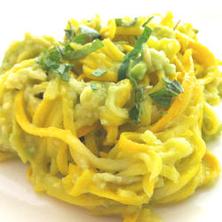 Note: This recipe uses yellow zucchini, which looks more like real noodles, but you can also use green zucchini to create this dish.